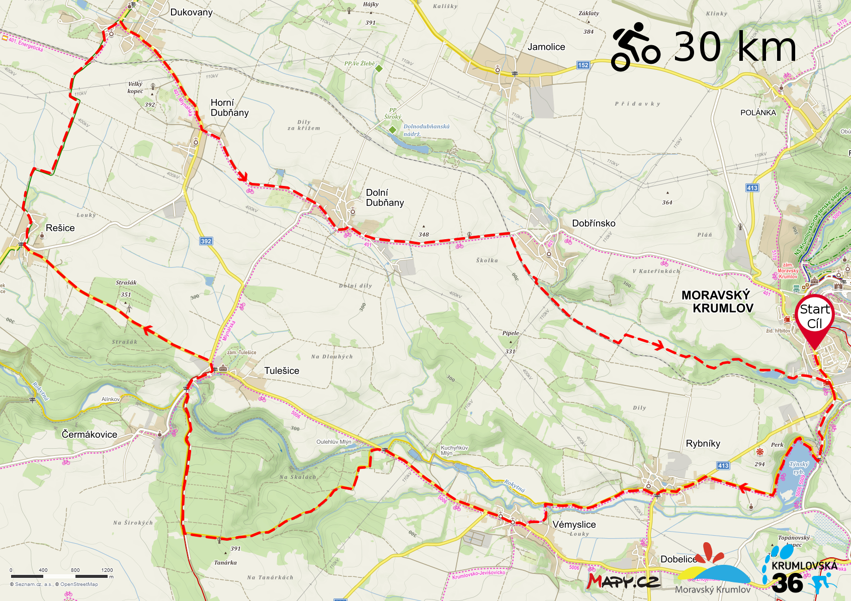 30 km - Restaurace U Blondýny - Vémyslice (7km) - Tulešice - Rešice (13km) - Dukovany - D. Dubňany (20km) - Dobřínsko - Restaurace U Blondýny