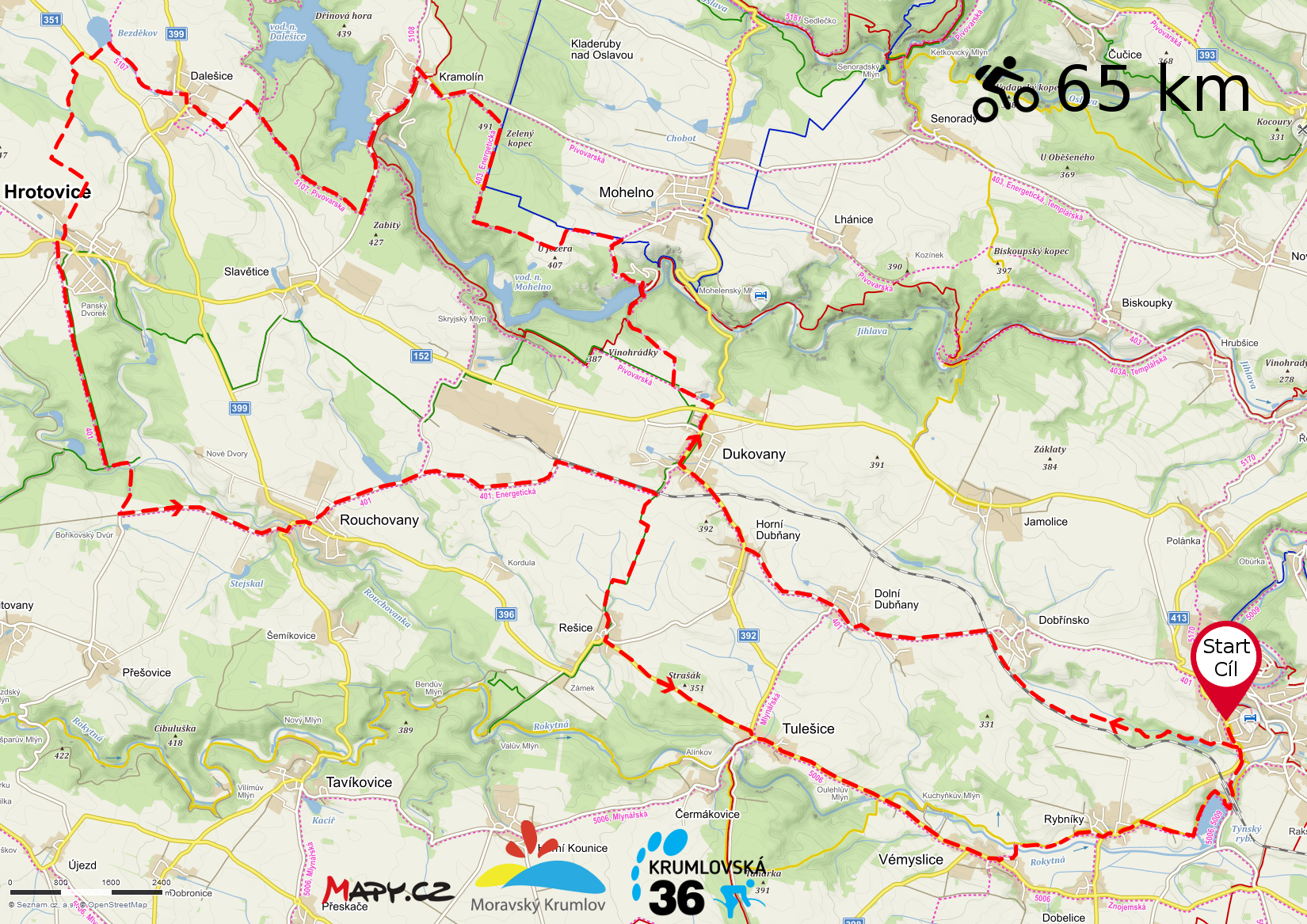 65 km - Restaurace U Blondýny - Dobřínsko - D. Dubňany - H. Dubňany - Dukovany - Kramolín - Dalešice - Hrotovice - Rouchovany - Rešice - Tulešice - Vémyslice - Rybníky - Restaurace U Blondýny
